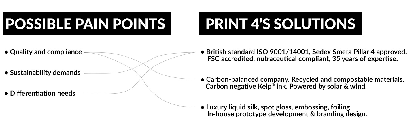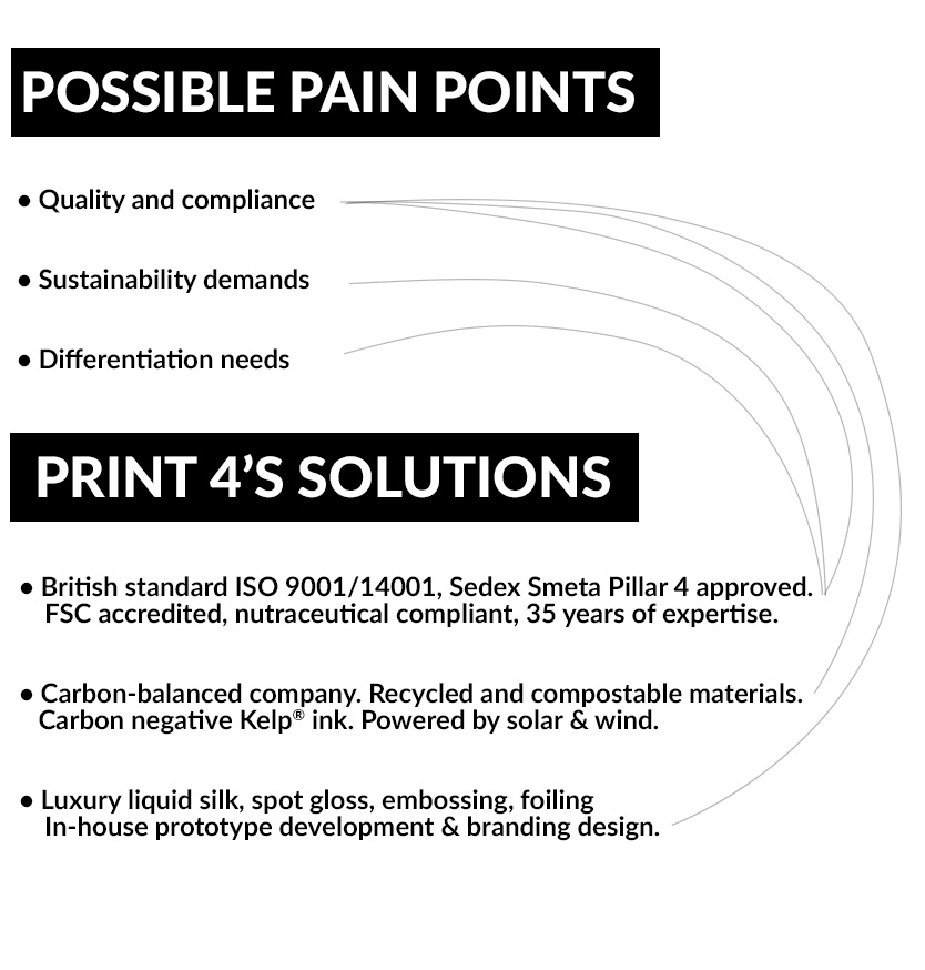 • They can package heavier products • Stores flat when not in use • Displays well on retail or point of purchase displays • Pre glued/taped • Fast and easy assembly • Can be customised to fit any needs including cut out apertures showcasing your product • Bespoke sizes making us not just a strong fit for the nutraceutical market, but the definitive solution to its most critical packaging challenges. We already have the credentials and the technology.